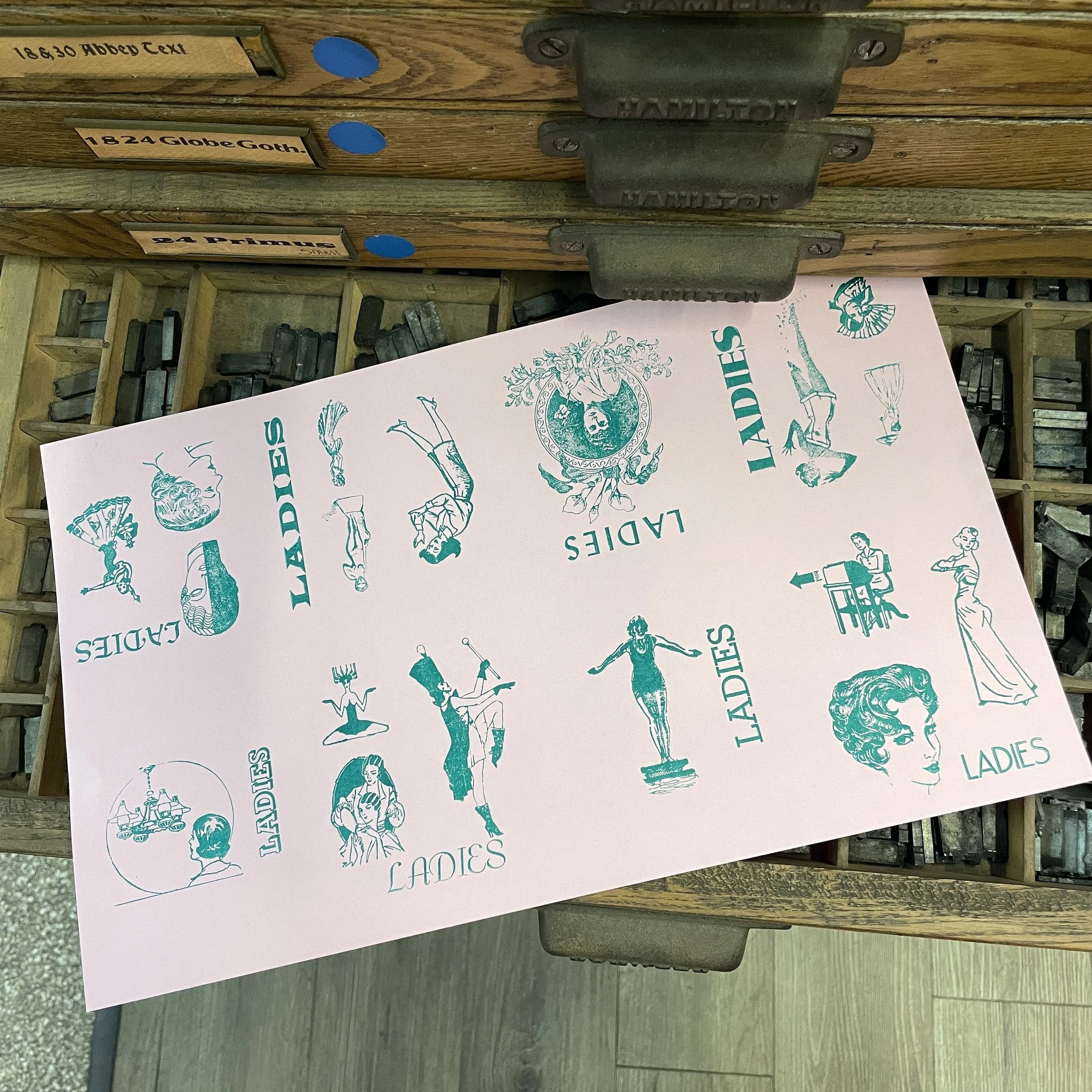 We did NOT end up using the lady cuts in the workshop but the ladies continued to haunt me. I went back into the collection and pulled out every woman I could find who was on her own or doing an activity without a man. I locked them up in a press, used different fonts of metal type to write LADIES over and over, and then letterpress printed it. It was an interesting exercise in ruminating on how commercial art historically interpreted gender but it’s also a silly little zine with a bunch of disembodied ladies.